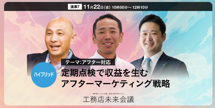 11月22日(金)10:50~12:10に、アフター戦略に注力されている工務店様2社をお迎えし、「定期点検で収益を生むアフターマーケティング戦略」をテーマにした対談セッションを開催します。弊社からは専務取締役 井上が登壇いたします。